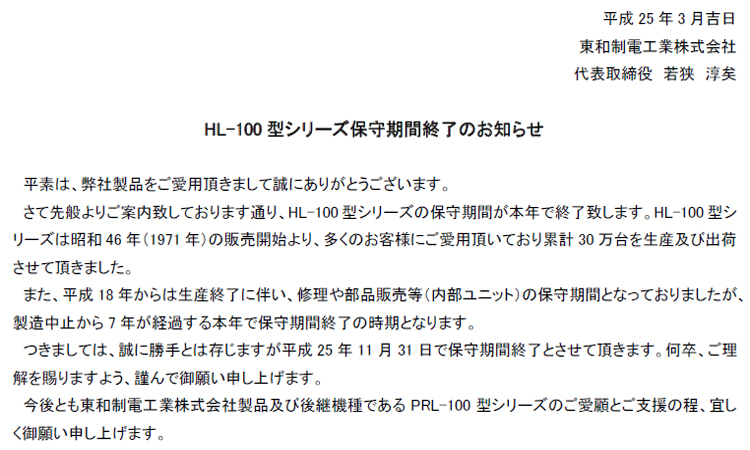 自2013年11月起,將終止生產HL-100系列的阻旋式料位開關,PRL-100系列阻旋式料位開關將完全替代HL-100系列。