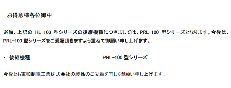 另外,上述HL-100型系列的后續機型為PRL-100型系列。今后,請再次惠顧PRL-100型系列。