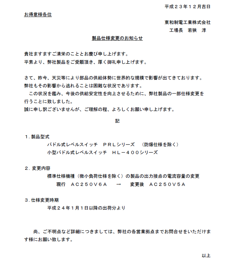 PRL-100/HL-400料位開關(guān)觸點電流容量變更聲明-日本東和TOWA
